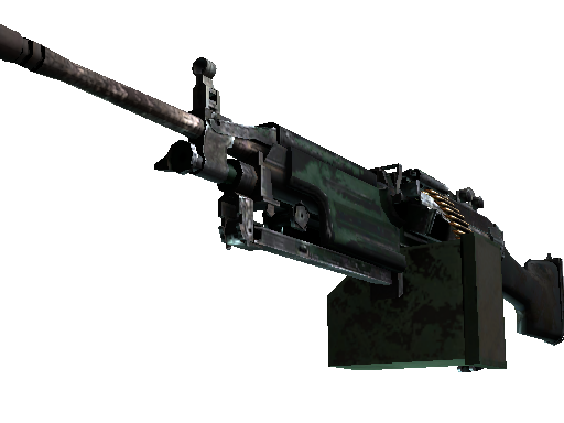 A strong open-area LMG, the M249 is the perfect choice for players willing to trade a slow fire rate for increased accuracy and a high ammo capacity. It has individual parts spray-painted solid colors in a jungle color scheme.
