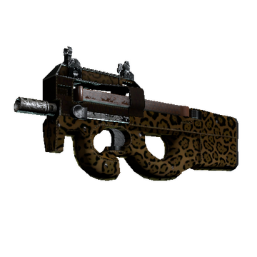 Easily recognizable for its unique bullpup design, the P90 is a great weapon to shoot on the move due to its high-capacity magazine and low recoil. It has been custom painted with a jaguar pattern and finished with pebbled leather.