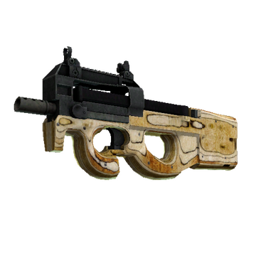 Easily recognizable for its unique bullpup design, the P90 is a great weapon to shoot on the move due to its high-capacity magazine and low recoil. The wooden stock has been hand-carved, sanded, and laminated.