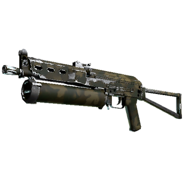 The Bizon SMG is low-damage, but offers a uniquely designed high-capacity drum magazine that reloads quickly. It has been spray-painted using leaves as stencils.
