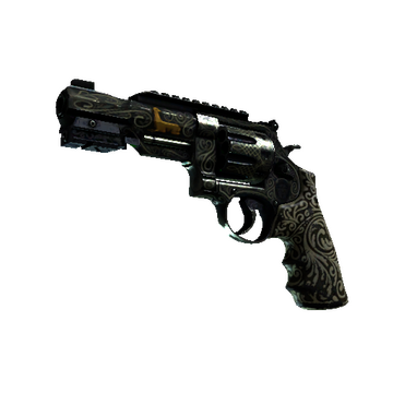The R8 Revolver delivers a highly accurate and powerful round at the expense of a lengthy trigger-pull. Firing rapidly by fanning the hammer may be the best option when point-blank stopping power is required. Its ivory handle is paired with ornate, engraved flourishes on blue metalwork.