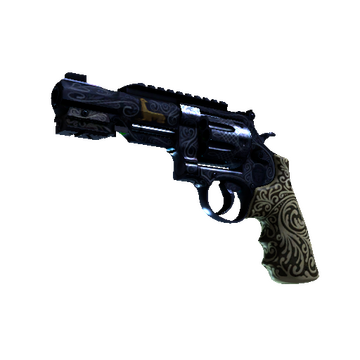 The R8 Revolver delivers a highly accurate and powerful round at the expense of a lengthy trigger-pull. Firing rapidly by fanning the hammer may be the best option when point-blank stopping power is required. Its ivory handle is paired with ornate, engraved flourishes on blue metalwork.